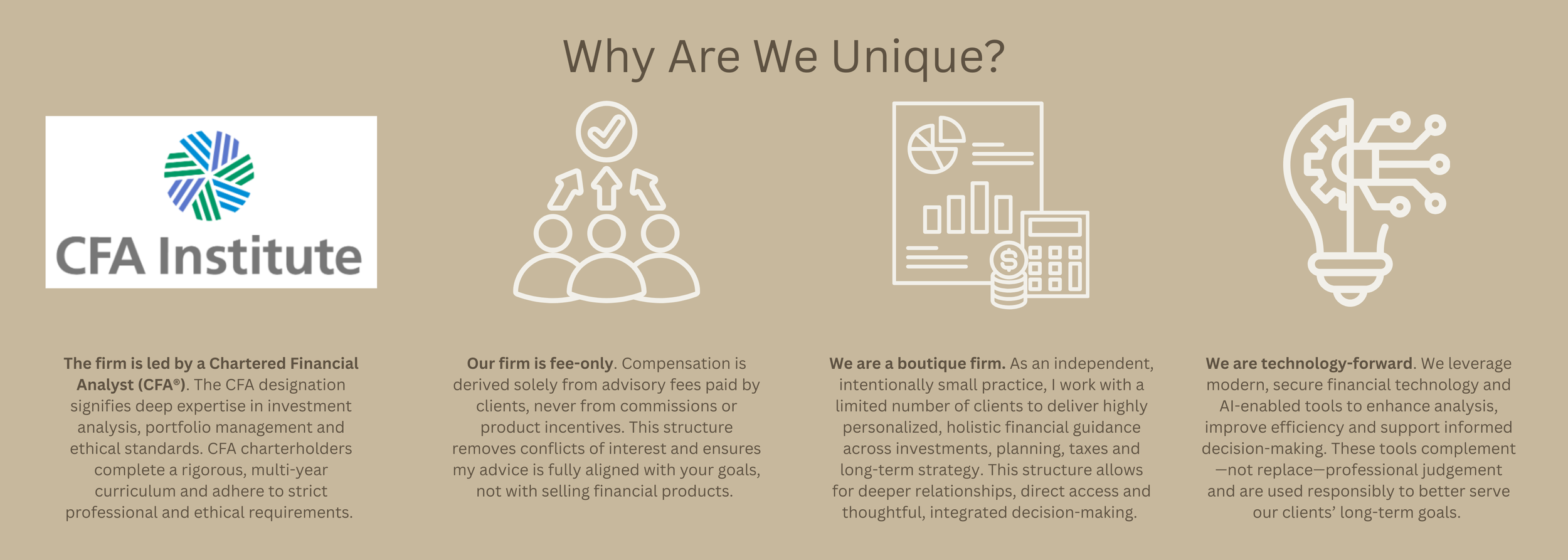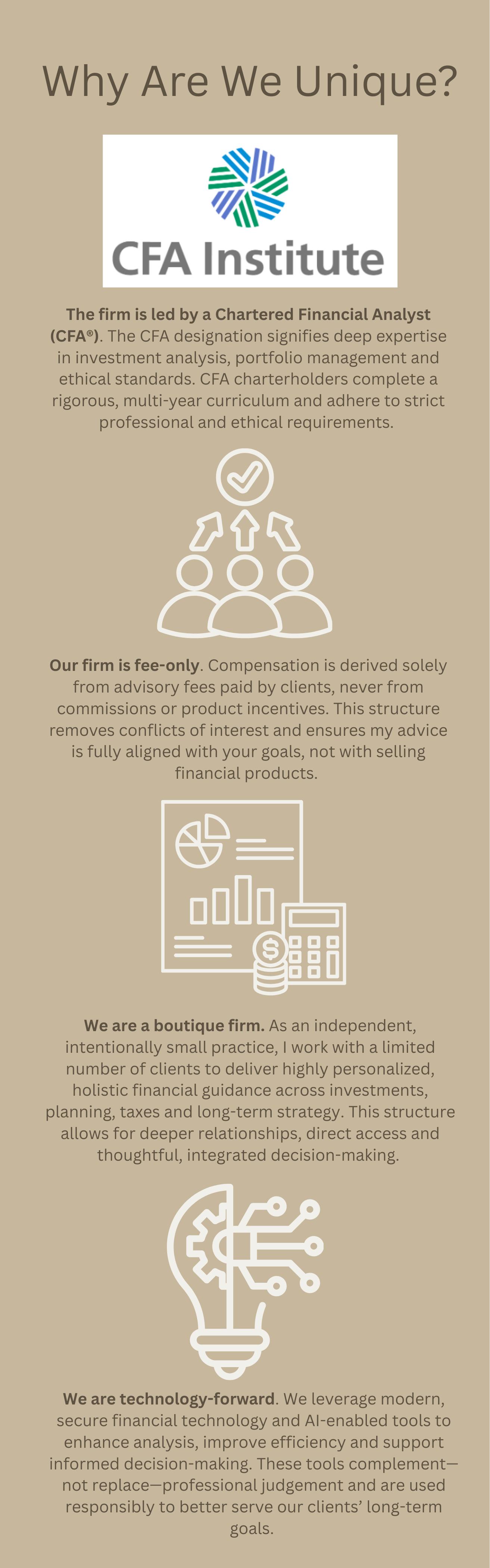 Our approach starts with getting a clear understanding of our clients’ goals, risk tolerance and time horizon. We then combine disciplined investment expertise with tech forward & AI-enabled analytical tools to support portfolio construction, monitoring, and risk management.